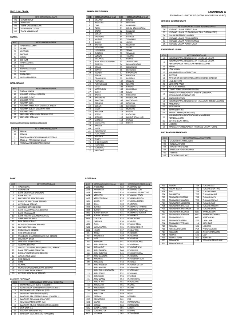 Poskod Bandar Negeri BORANG MAKLUMAT MURID MODUL PENGURUSAN MURID SISTEM PENGURUSAN SEKOLAH KEMENTERIAN PENDIDIKAN MALAYSIA hari bulan tahun Warganegara hari bulan. Borang maklumat murid modul pengurusan murid bahasa pertuturan kod keterangan bahasa pertuturan kod keterangan bahasa pertuturan 1 melayu 73 bugis 2 inggeris 74 khek hakka 3 cina 75 teochew 4 tamil 76 kongfoo 5 bajau 77 kanowit 6 dusun 78 lirong 7 kadazan 79 lemanak 8 murut 80 lahanan 9 suluk 81 lisum atau lugum 10 brunei 82 manura 11. JARAK KE SEKOLAH.